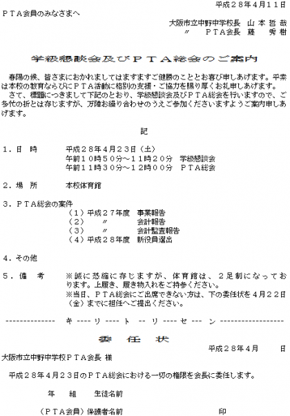 4月23日(土)に土曜授業後に学級懇談会、PTA決算総会を行います。昨日、子どもたちを通じて配布しておりますが、担任の先生とお話をさせていただく貴重な時間です。また、その後、体育館でPTA決算総会が行われます。PTA行事にも奮ってご参加いただきますようよろしくお願い申しあげます。