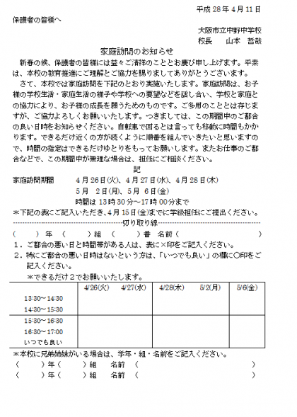 4月11日(月)全学年の生徒に家庭訪問のご案内を配布しています。