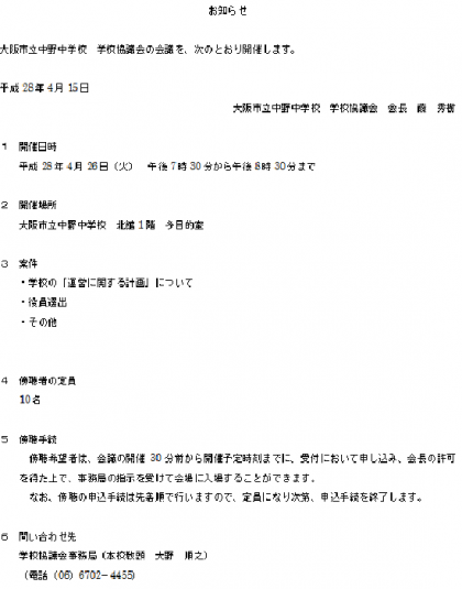 4月26日(火)の午後7時30分より、北館1F多目的室で中野中学校第1回学校協議会を開催いたします。傍聴される方は10名までとなっていますが、お越しください。本日、子どもたちにお知らせのプリントを配布しております。
