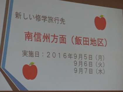 2時間目に、3年生の保護者向けに修学旅行の説明会を行ないました。この度の熊本地震に鑑み、安全性を考慮して、9月5日〜7日の日程で信州方面に修学旅行を変更して行なう事に致しました。詳しくは7月に、再度修学旅行説明会を行う予定にしています。