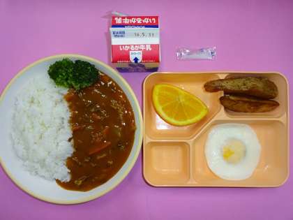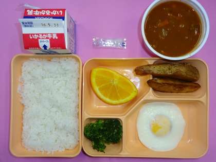 今日の給食では、鶏卵を目玉焼きに加工したものを使用しています。味つけはしていませんが、塩の小袋をつけていますので、フライドポテトとうまく振り分けて食べてもらうようにしています。