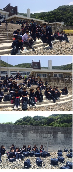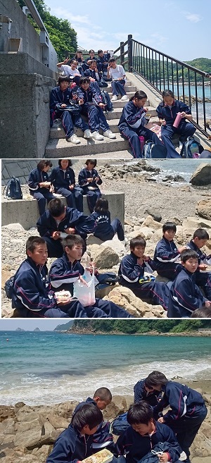 集合の後、みんなでお弁当を食べました。目の前は海、周囲は緑あふれる木々等、自然に親しみながらおいしく食べました。