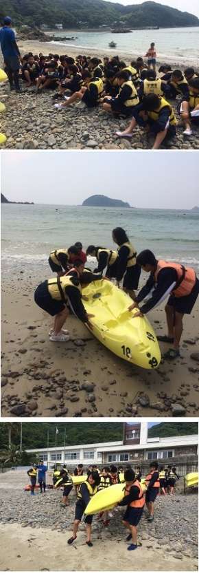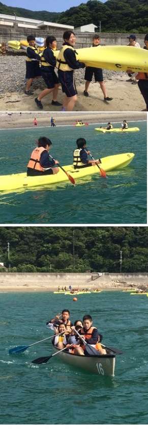 カヌー・カヤックを体験する海のプログラムに子どもたちは取り組んでいます。ライフジャケットを装着して職員の方を説明を聞いて、さあ、始めるぞ!