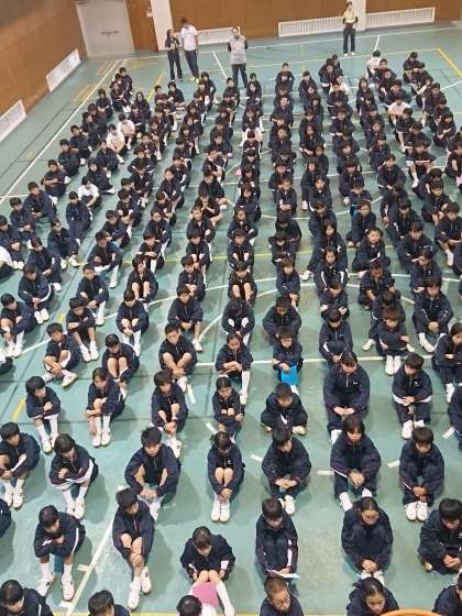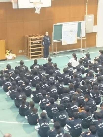 朝ご飯の前、朝の連絡事項を伝達しています。
