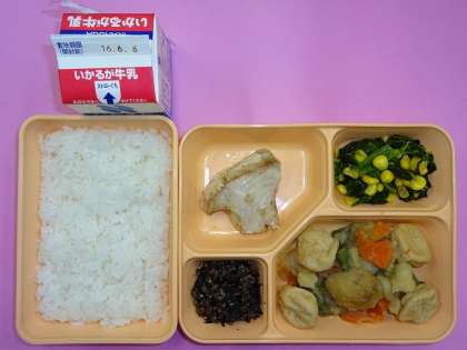 今日の給食では、しょうゆとマヨネーズで味つけして焼いています。