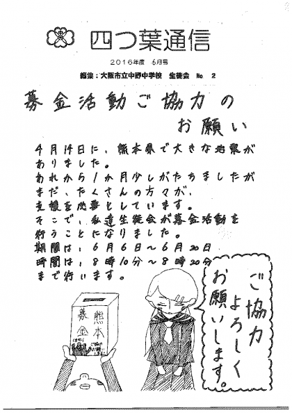 6月6日(月)〜20(月)の予定で、生徒会では熊本震災の義援金募金を行なっています。