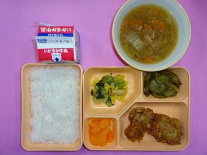 今日の給食では、鶏肉に、しょうが、料理酒、塩で下味をつけ、でんぷんをまぶして油で揚げ、白ねぎ、砂糖、こい口しょうゆ、酢を合わせ、そしてこれに柚子果汁(ゆずかじゅう)を加えて風味をつけたソースをかけています。