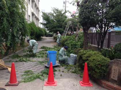 6月27日(月)〜29日(木)の3日間、成南校園営繕園芸事務所のみなさまが中野中学校へ来られて、中野中学校正門周辺の樹木の剪定を行っていただいております。電柱のそばに生い茂った桜の木がもたれかかりとても危険な状態です。そのため樹木の剪定を行っています。成南校園営繕園芸事務所のみなさまが作業を行っていただくことで安全・安心な学校に近づいていきます。成南校園営繕園芸事務所のみなさま、ありがとうございます。