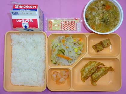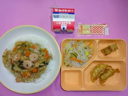 今日の給食では、ムキエビを中華丼の材料として使っていますが、おかず容器に分けて盛りつけ、食べるときに自分で中華丼の方へ盛りつけるようにしています。