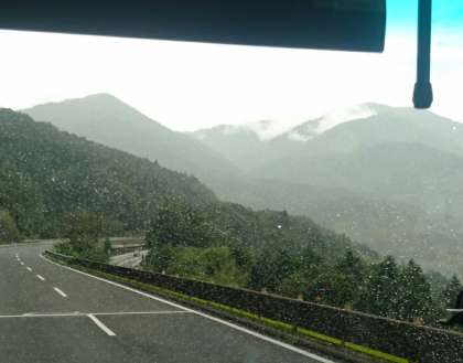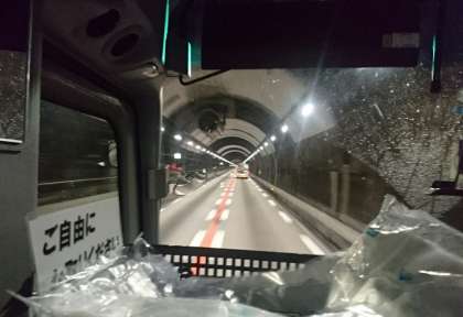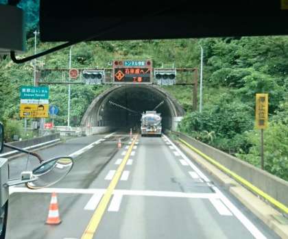 バスは小雨の中、恵那山の麓、岐阜と長野県境、恵那山トンネルをくぐります。中央道で最も長い8650m トンネルを越えると長野県です。