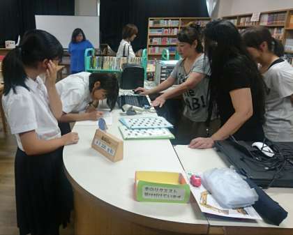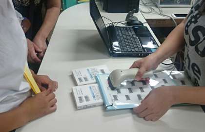 夏休みに、親和会様、PTA様などにお手伝いいただき、7,000冊の図書室のバーコード化ができました。早速、利用しています。
