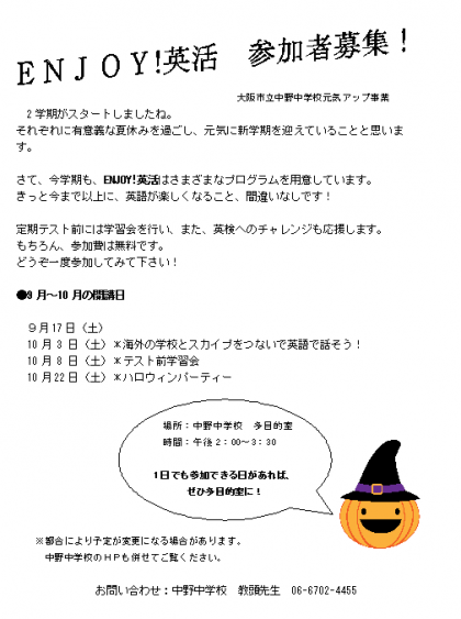 元気アップ地域本部では、隔週土曜日、14:00〜16:00に多目的室で行なわれている、ENJOY!英活 に参加される生徒を募集しています。