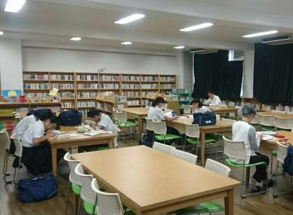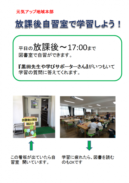 給食のある平日の放課後は、図書室で『放課後自習室』が開催されます。・黒田先生や学びサポーターさんが部屋にいて、勉強も教えてくれます。気軽に図書室で学習しよう!本を読んでもいいですよ。