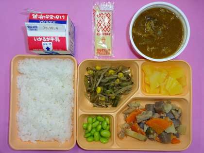 今日の給食では、牛肉、うすあげ、なす、たまねぎ、しめじを材料にして、だしこんぶとけずりぶしでとっただしで煮、カレールウ、醤油などで味つけしています。