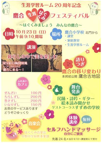 10月23日(日)鷹合小学校で行われる鷹合「生涯・はぐくみ」フェスティバルに中野中学吹奏楽部が出演します。時間は午後2時〜、場所は講堂です。どうぞ応援にいらしてくださあいね。
