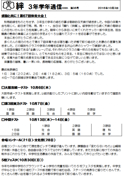10月3日(月)3年生学年通信『絆』を配布しています。