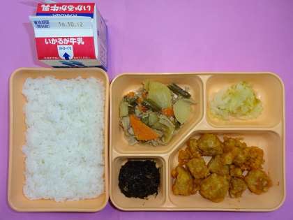 今日の給食では、マグロをから揚げにして、ケチャップ、みそ、砂糖を合わせたソースをからめ、オーロラ煮としています。