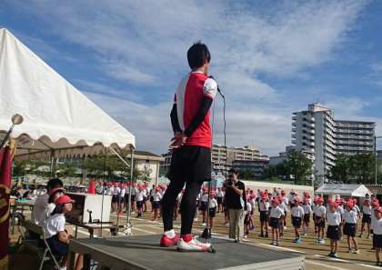 先週の東田辺・南百済小学校に続いて、今週は湯里小学校で運動会が行われています。「ミスター運動会」紅白のTシャツ・靴下・靴を身にまとった先生の諸注意で運動会は始まります!