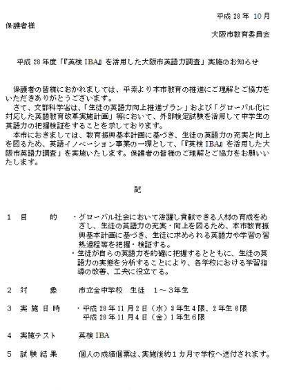 平成28年度「『英検IBA』を活用した大阪市英語力調査」実施のお知らせ