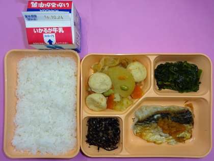 今日の給食では、「おろしじょうゆかけ」と「おひたし」には、濃口しょうゆを、「牛ひじきそぼろ」には淡口しょうゆを、「煮もの」には両方のしょうゆを合わせて使用しています。