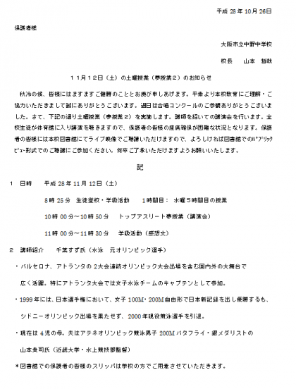 今年から、全学年が体育館に入れるようになりましたので、保護者の方の観覧が多い場合、図書室での「パブリックビュー」をお願いしたいと存じますが、千葉さんには講演の後、図書室によっていただく予定ですので、どうぞたくさんの保護者の方の来校をお待ちしています。