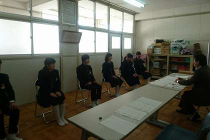 12月19日(土) 3年生の校長面接の最後 3年7組の模擬面接を行ないました。緊張の中、自分の意見をしっかり言えている生徒もいましたし、言葉に詰まる生徒もいました。この経験を元に、再度、自分の意見を練り直し、当日に臨みましょう。
