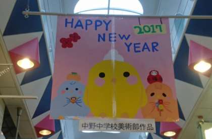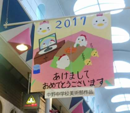 昨年末から美術部では酉年の干支にちなんで下の写真の作品を作りました。この作品は校区4小学校の児童の作品と一緒に駒川商店街に掲示されています。どうぞ美術部の作品をご覧ください。