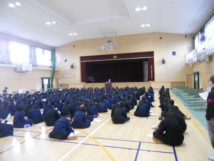 22日(水)6時間目、1年生は体育館でハローワークあべの(阿倍野公共職業安定所)の学卒ジョブサポータ−の川口廣和さんをお招きして「働きがいのある仕事を見つけるために」をテーマに約40分間お話していただきました。川口さんから「働くということは」自分のため、家族のために働いて物をつくる、サービスを提供することで他人のために役立つことなる。働くことはまわりまわって他人のために働くことにつながるのです。」「社会において必要な基本的なマナーは1、あいさつができる 2、人の話をよく聞く(コミュニケーション能力)、3、ルール(社会的)を守ることです。」「企業(会社)が求める人は1、積極性がある人 2、協調性がある人 3、責任感がある人」などを子どもたちにお話してくれました。最後に「学校は社会とつながっている。学校で社会に出るために必要なことを学べます。学校生活をしっかり頑張ってください。」とわかりやすく語ってくださいました。1年生のみんなにとって貴重な1時間となりました。川口さんありがとうございました。