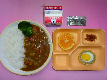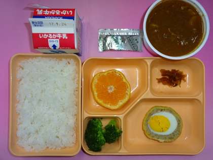 今日の給食では、2つに割った製品にケチャップを添えました。
