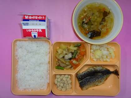 今日の給食では、イワシは「かば焼き」として、大豆はシロップときな粉ををまぶして手づくりで味付けした「福々豆(ふくふくまめ)」を献立に取り入れています。
