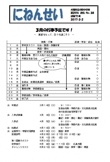 2年生学年通信『にねんせい』3月2日号