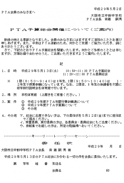 委任状に捺印のうえ、担任にお渡しいただきますようによろしくお願いいたします。