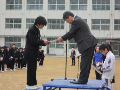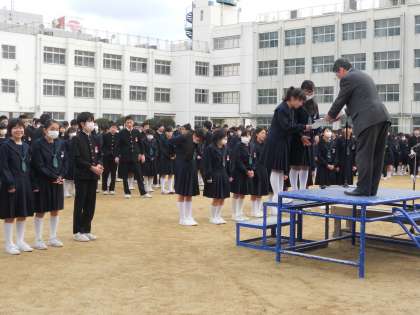 1月20日(月)に防災訓練を行った時に全校集会を行って以来、健康管理のために全校集会ができていませんでしたが、久しぶりに全校集会を開きました。今日は校内マラソン大会、男女バスケットボール部3位、少林寺拳法部の近畿大会出場の表彰を行いました。全校生徒の前で表彰されるように行事や部活動に励みましょう!