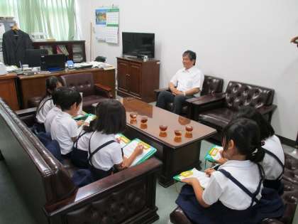 5月23日(火)1000、南百済小学校の2年生7人が、中野中学校に生活科の学習の一環として「町たんけん」に来られました。