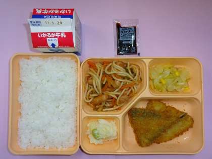 今日の給食では、パン粉の衣が付いた鯵のフライに、トンカツソースを添えました。