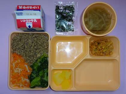今日の給食では、スープの具材として使用しています。