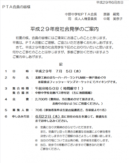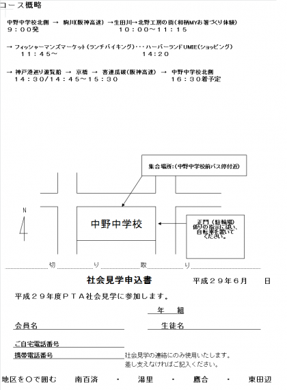 以前、配布しましたが、PTA社会見学のご案内を再度致します。