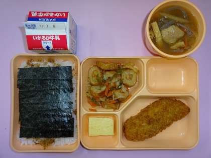 ☆今日の給食は、ご飯の上にじゃこをのせて、のりをのせるとのり弁当のようになります。
