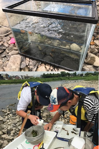 7月27日 水生生物調査会に理科部の1年生3人で京都の渡月橋まで行きました。
