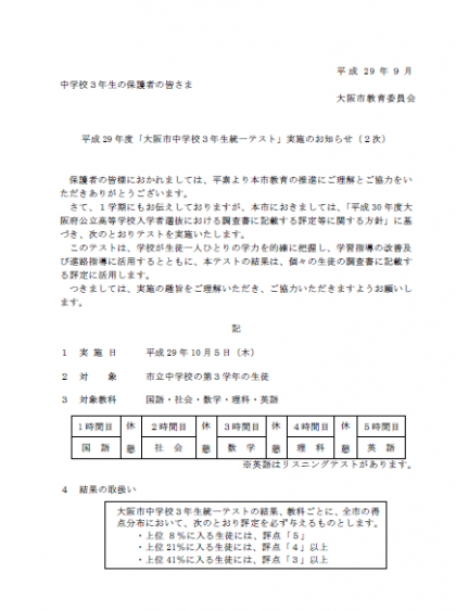 大阪市統一テスト実施のお知らせ 〜3年生〜