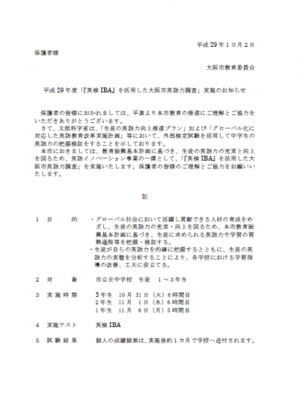 平成29年度「『英検IBA』を活用した大阪市英語力調査」実施のお知らせ