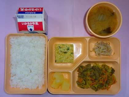 今日の給食では、鶏挽肉、とうふ、コーン、みつばなどを卵に加えて焼いています。卵だけで焼くのではなく、色々な具材をとり合わせることで、さらに栄養価を高めることもできます。