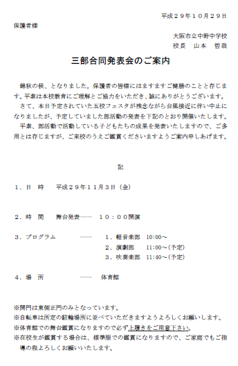 一方で、五校フェスタでは、生徒が解散した後の午後の部より、軽音楽部・演劇部・吹奏楽部の発表会も予定しておりました。これは3年生の引退の公演でもありましたので、部の顧問が話し合い、この度11月3日に、3つの部が主催して、合同発表会を行なう事となりましたので、お知らせいたします。