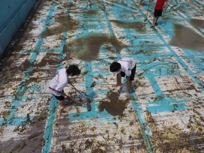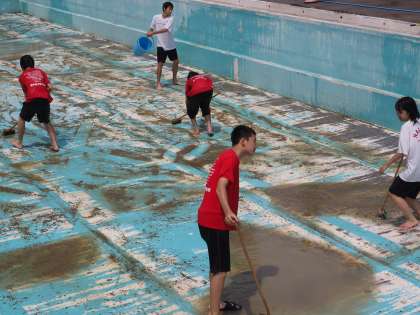 ゴールデンウィーク中からのプール開きに向けて水泳部の子どもたちがプールを掃除しました。掃除をすると、プールの底には冬の北風の影響で石や砂がたくさんたまっていました。クラブで気持ちよく練習するために、一生懸命掃除をしました!