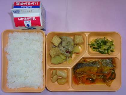今日の給食では、豚肉、あつあげ、さつまいも、れんこんなどとともに煮ものにしています。