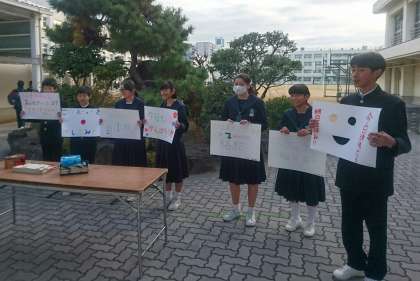 今日も、自作のポスターを持ってのあいさつ運動です。