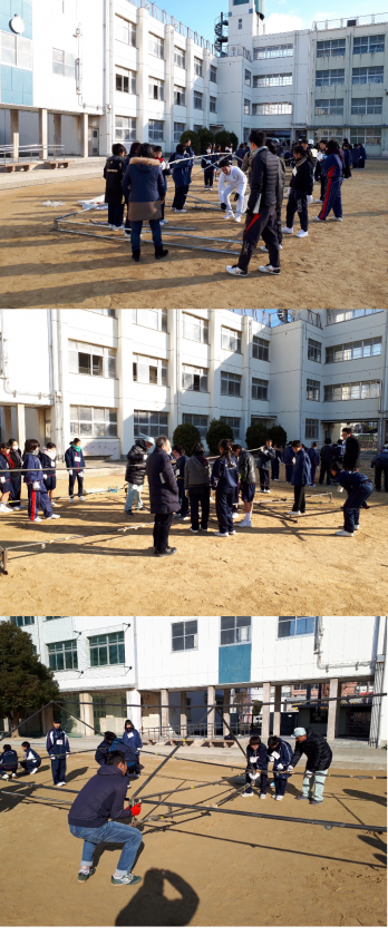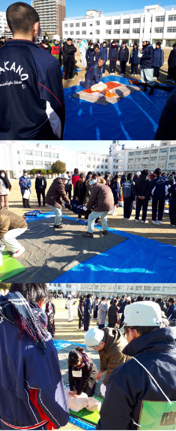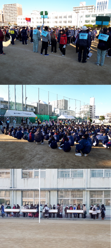 続いて、南百済地域主催の防災訓練です。4小学校区に分かれて集合の後、救命訓練・テントの組み立ての訓練を行ないます。