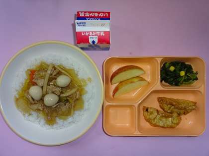 今日の給食では、「中華丼」に使用しますが、うずら卵以外の具は、保温食缶で配送し、うずら卵はおかず容器に味つけしたものを入れていますので、各自で中華丼の方に移して食べてもらうようにしています。