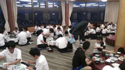 予定より少し夕食が遅くなっていますが、今、子どもたちはホテルでの夕飯を食べています。作ってくださったホテルのみなさんに感謝して、たくさん食べましょう!