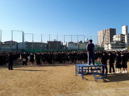 寒い日が続いたり、天候も不純でしたので、長く放送集会を行なってきましたが、今日は暖かく、久々にグラウンドにて全校集会を行いました。3年生が揃う全校集会もあと少しです。